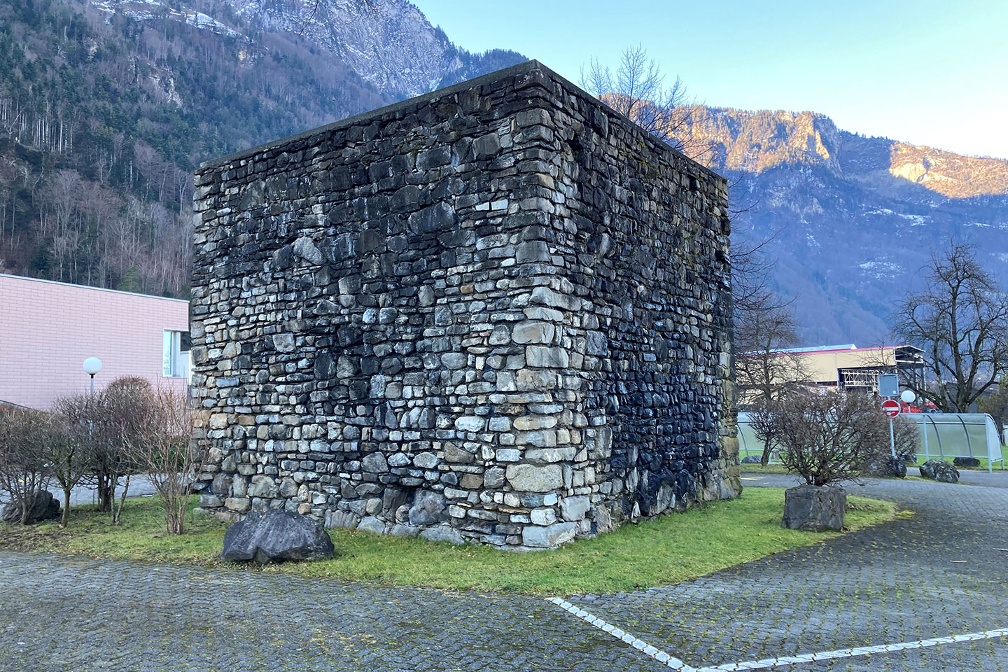 Neben dem Kreisschulhaus steht die Ruine des feudalen Turmes von Seedorf.